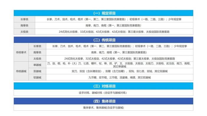 本届武博会采用“1个主会场+7个专场”的创新模式,主会场设于虹口区精武体育馆,涵盖竞技武术、传统武术、对练项目、集体项目,以及境外人员段位考评五大单元,包括长拳、南拳、太极拳等数十种拳术及刀、剑、棍、枪等器械项目。