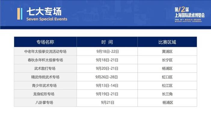 七大专场覆盖各年龄层与各武术项目,中老年太极拳交流活动专场展现传统养生智慧,青少年武术专场彰显新生代风采,其他专场汇聚各类武艺精髓。赛会场地辐射虹口、黄浦、长宁、杨浦、松江等区,还将延伸至长三角,力争实现“全域联动、全时精彩”。