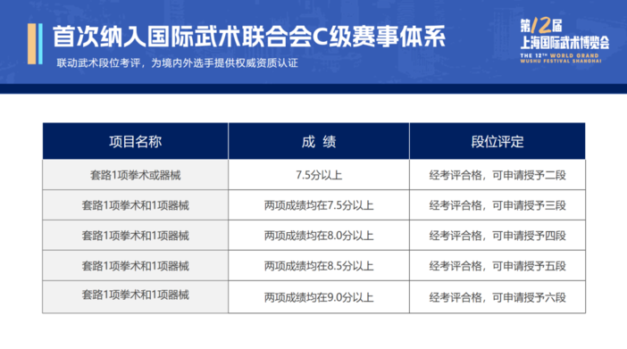 本届武博会首次纳入国际武术联合会C级赛事体系,联动武术段位考评,为境内外选手提供权威资质认证。境内选手参赛成绩达到相应分数可申请参加段位考评,合格者授予相应段位。境外选手则可通过参加中国武术段位制境外人员段位考评,获得相应段位。