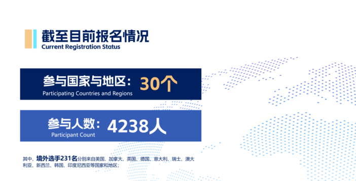 截至发布会当天,赛会已吸引来自全球30个国家和地区的4238名武术爱好者踊跃报名。境外选手分别来自美国、加拿大、英国、德国、意大利、瑞士、澳大利亚、新西兰、韩国、印度尼西亚等国家和地区,展现出武术运动广泛的群众基础和强大的国际影响力。