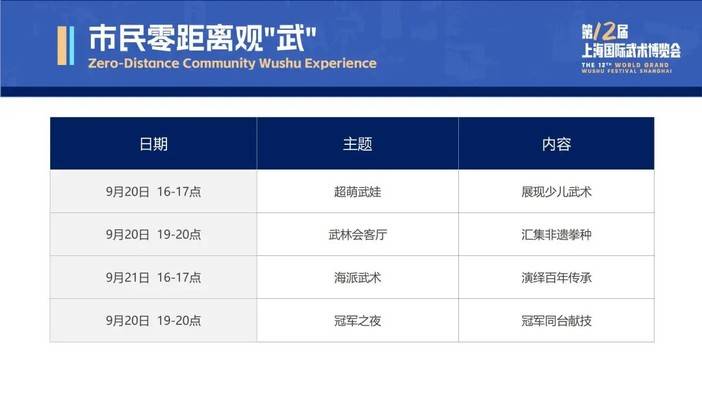 值得一提的是,本次武博会所有专场演出将以全开放城市空间形式面向市民及游客展示。观众可通过“上海国际武术博览会”官方微信公众号或“上海武术院”公众号预约观看。主会场及7个专场的各项赛事同样开放预约观赛。预约通道将于9月10日上午10:00开启。