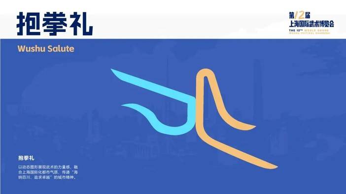 核心视觉由金色左掌和天蓝色右拳以两道流畅线条勾勒而成,代表黄浦江与苏州河的交汇,既是对“抱拳礼”的凝练表达,也展现了上海“江河入海”的胸怀。