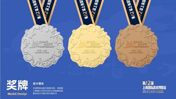 奖牌正面镌刻会徽与赛会名称,背面融入黄浦江与苏州河交汇的抽象线条,象征武术与城市的交融共生。