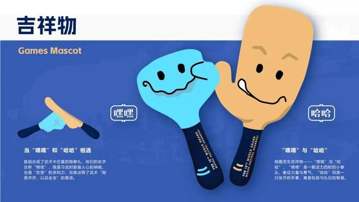 赛会吉祥物名为“嘿嘿”与“哈哈”,“嘿嘿”是一颗活力四射的小拳头,象征力量与勇气,“哈哈”则是一只张开的手掌,寓意包容与礼仪的智慧。当“嘿嘿”和“哈哈”相遇,就组合成了武术中庄重的抱拳礼,他们的名字合称“嘿哈”,既是习武时振奋人心的呐喊,也是“欢笑”的亲和力,完美诠释了武术“刚柔并济,以武会友”的真谛。