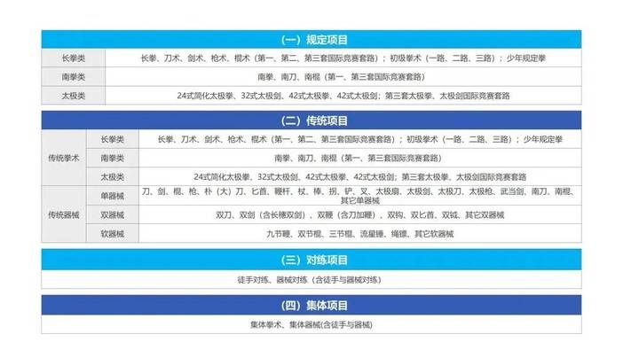 本届武博会采用“1个主会场+7个专场”的创新模式,主会场设于虹口区精武体育馆,涵盖竞技武术、传统武术、对练项目、集体项目,以及境外人员段位考评五大单元,包括长拳、南拳、太极拳等数十种拳术及刀、剑、棍、枪等器械项目。