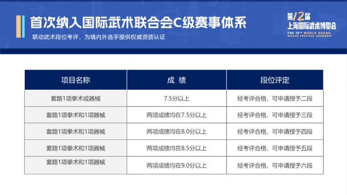本届武博会首次纳入国际武术联合会C级赛事体系,联动武术段位考评,为境内外选手提供权威资质认证。境内选手参赛成绩达到相应分数可申请参加段位考评,合格者授予相应段位。境外选手则可通过参加中国武术段位制境外人员段位考评,获得相应段位。