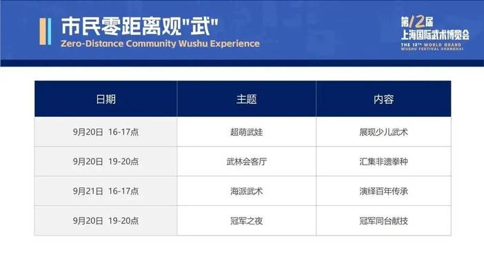 值得一提的是,本次武博会所有专场演出将以全开放城市空间形式面向市民及游客展示。观众可通过“上海国际武术博览会”官方微信公众号或“上海武术院”公众号预约观看。主会场及7个专场的各项赛事同样开放预约观赛。预约通道将于9月10日上午10:00开启。